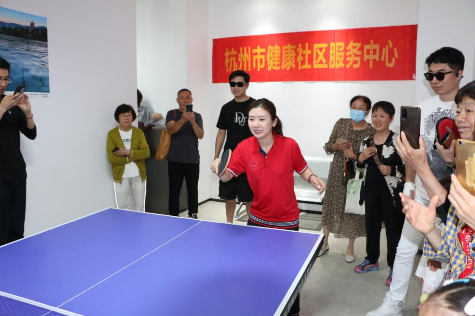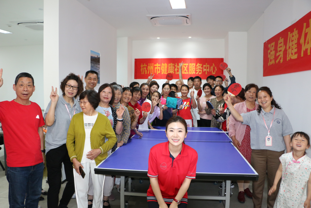 福原爱当天一大早就与团队来到了位于杭州三墩镇的社区福利院,为老人们送去礼品,并与她们切磋乒乓球、做小游戏,受到老人们的热情欢迎。